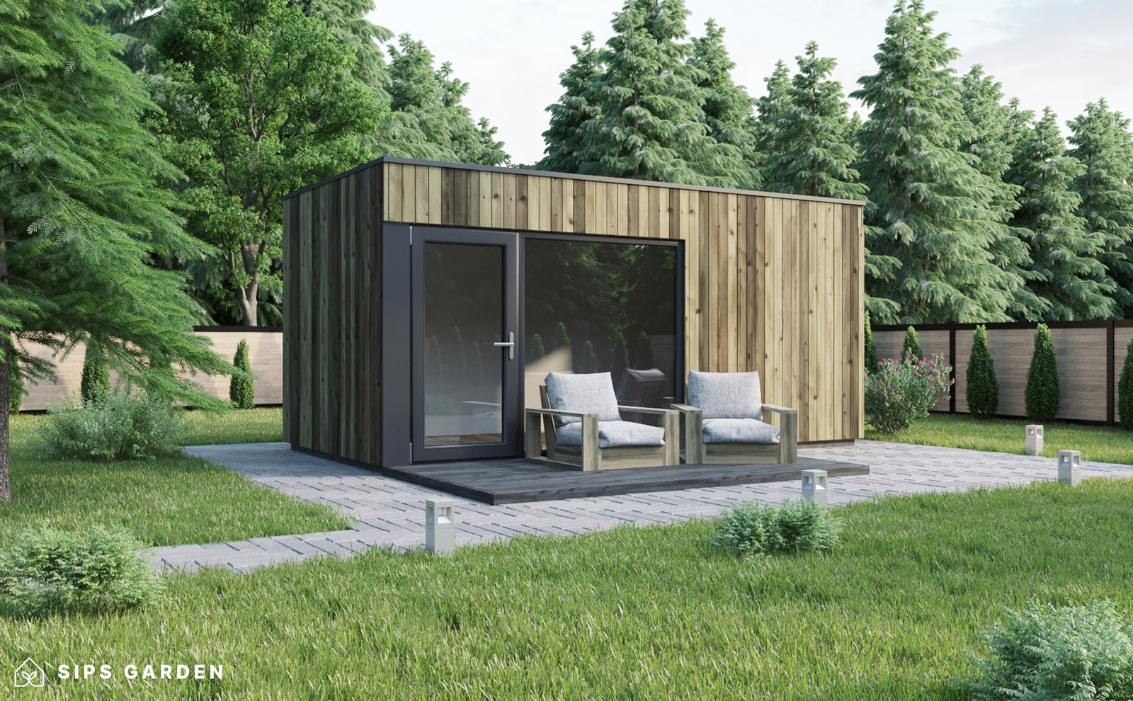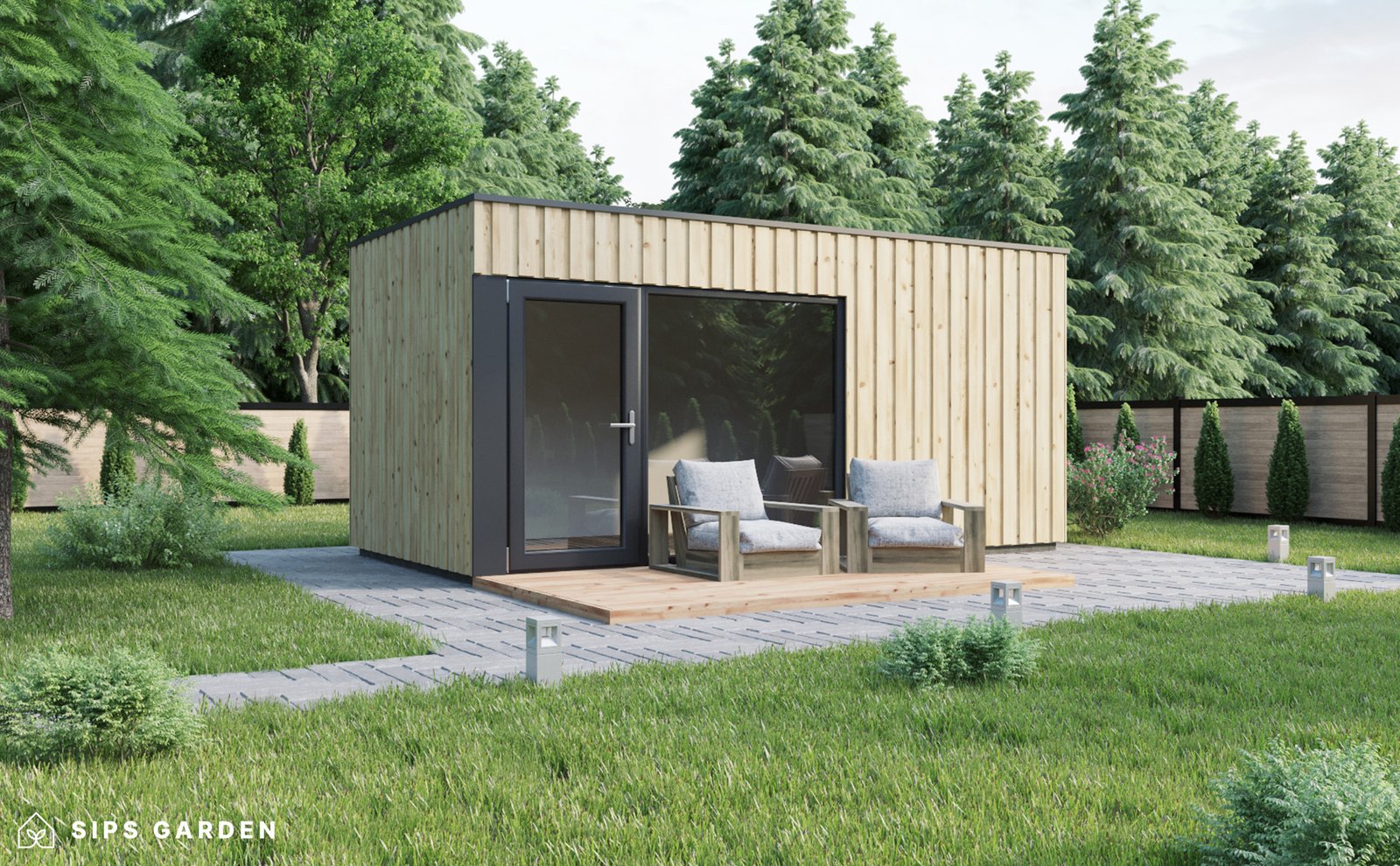 This product is crafted using an advanced, high-quality, and energy-efficient SIPs (Structural Insulated Panels) system, which ensures superior insulation and long-lasting durability. The exterior features anthracite grey PVC double-glazed windows and doors, complemented by an EPDM roof cover, a sturdy steel rain gutter, and elegant steel finishing details, all included as standard elements.